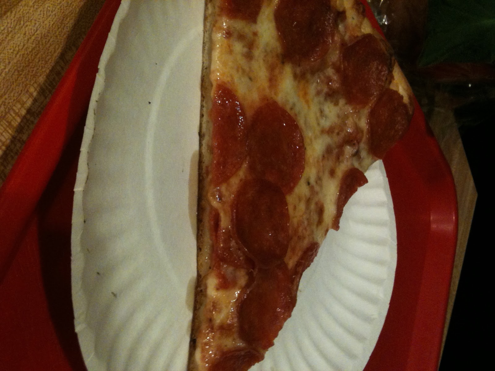 Once you get inside the door the kitchen area is open and you can watch pizzas being made. Each pizza is served with a savory sauce, generous helpings of toppings and the slices are huge (one could choose to share…could). The staff are friendly and ordering is a breeze. Once it’s your turn in line you place your order which is warmed up, pay and you can choose to eat in the restaurant or take it to go. The pizza is always fresh; each time I’ve gone in there is always a fresh pie being made or coming right out of the oven.
