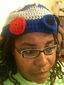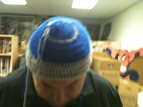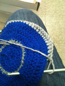 Anywho to create the beanie I used some blue Caron One Pound Yarn (I was supposed to be making Cookie Monster hats!) and some grey Vanna’s Choice. The beanie part of the pattern works up really quickly.