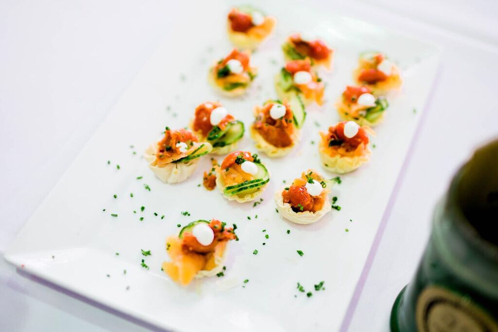 Iron Hill Brewery and Restaurant: Dehydrated Flank Bites over Pretzel Crostini with Boursin Cheese, Tomato Tapenade, and Chive Oil with Oktoberfest Lager