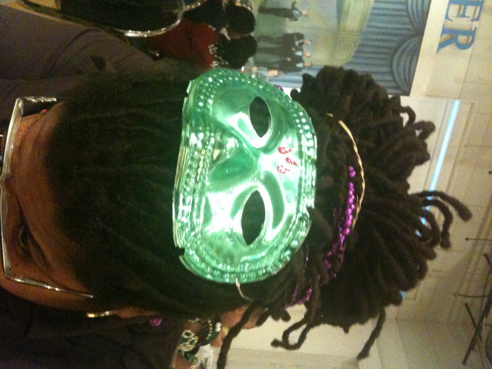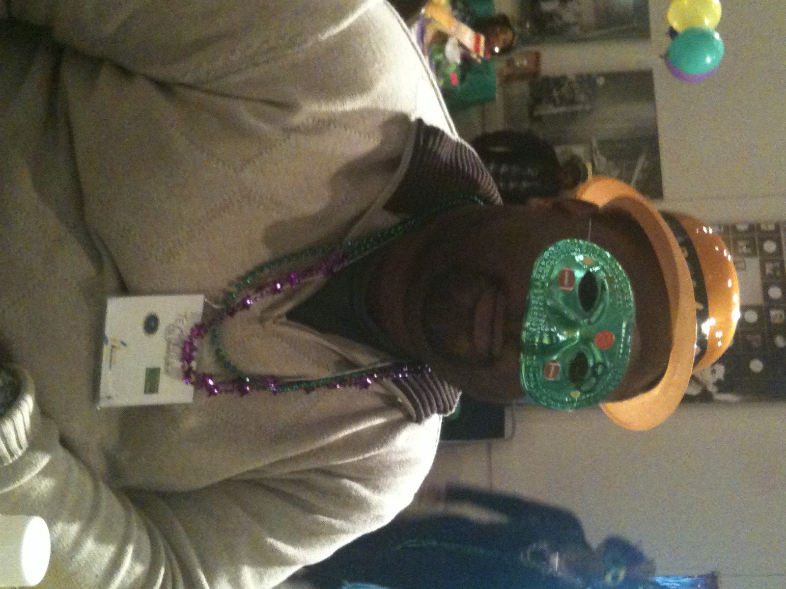 When we arrived we were greeted by a busy but friendly staff. They signed up is while we jammed to jaunty jazz tunes. The Mardi Gras court then showered us with beads after we shouted, “I LOVE SCIENCE!” While waiting for everyone to be checked in, supplies were available to decorate masks and hats which were provided in the swag bags. The Bee and Pop took this task to heart making glittery and bejeweled masks.