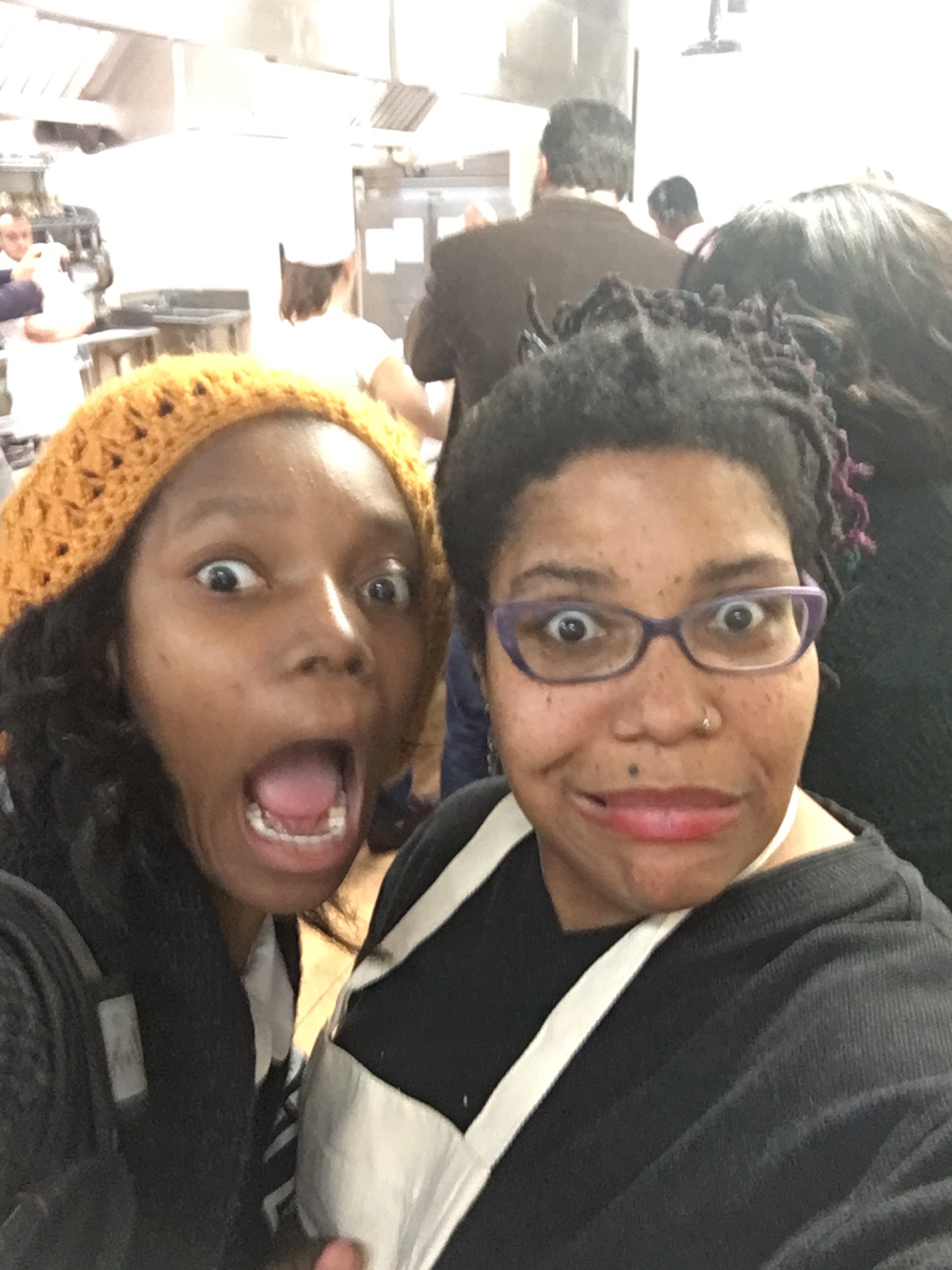 While the pies were cooling, we mingled with our competitors and tried some of the food prepared by the students from the school. The chefs even made a tray of dairy free fish tacos for The Bee and made sure she had appropriate drinks! We met some local celebs, among them I Heart Radios Mina and Nicole (who were both so sweet to The Bee that I just wanted to hug them) and then we had to prepare our fish dish.