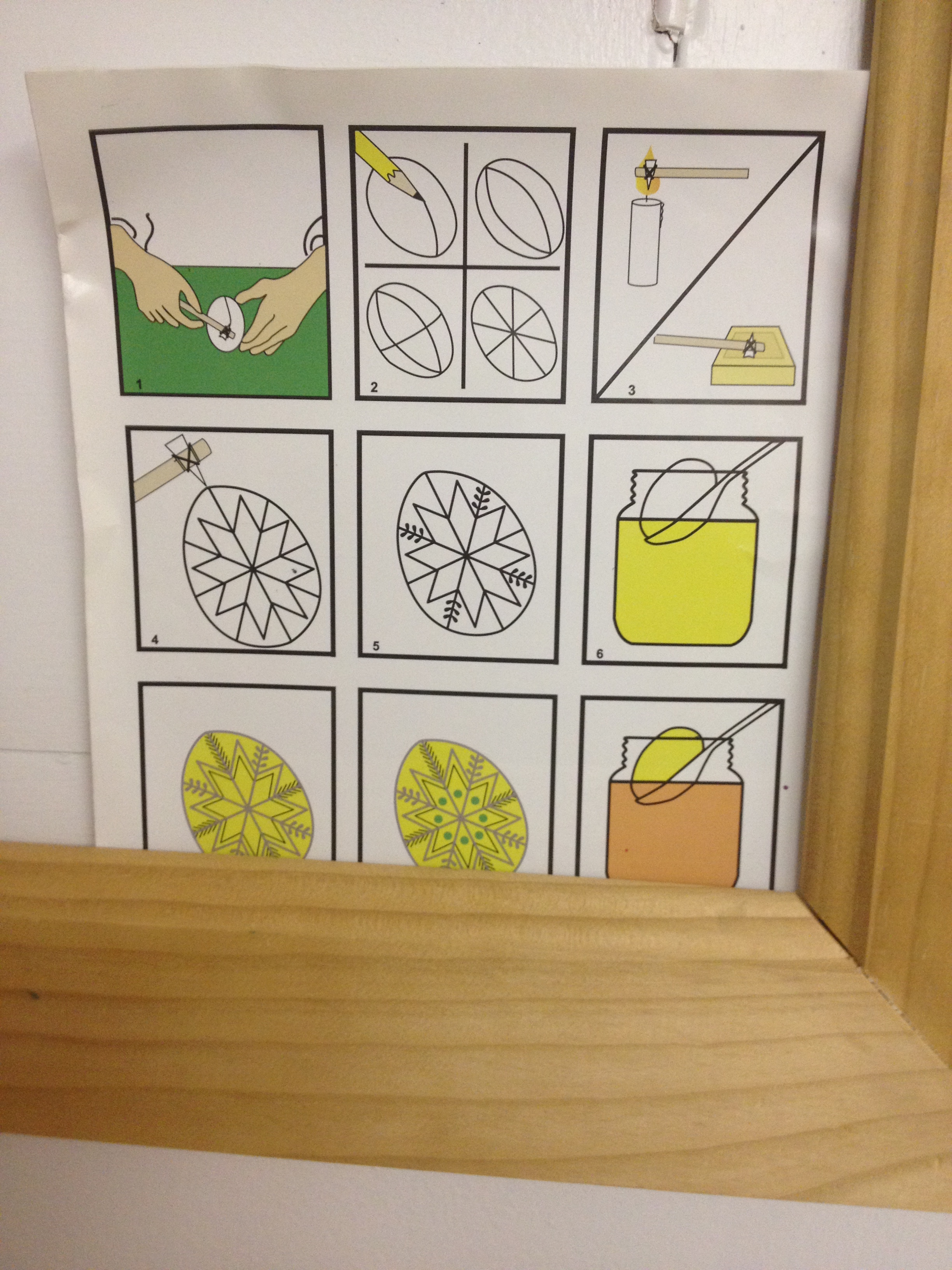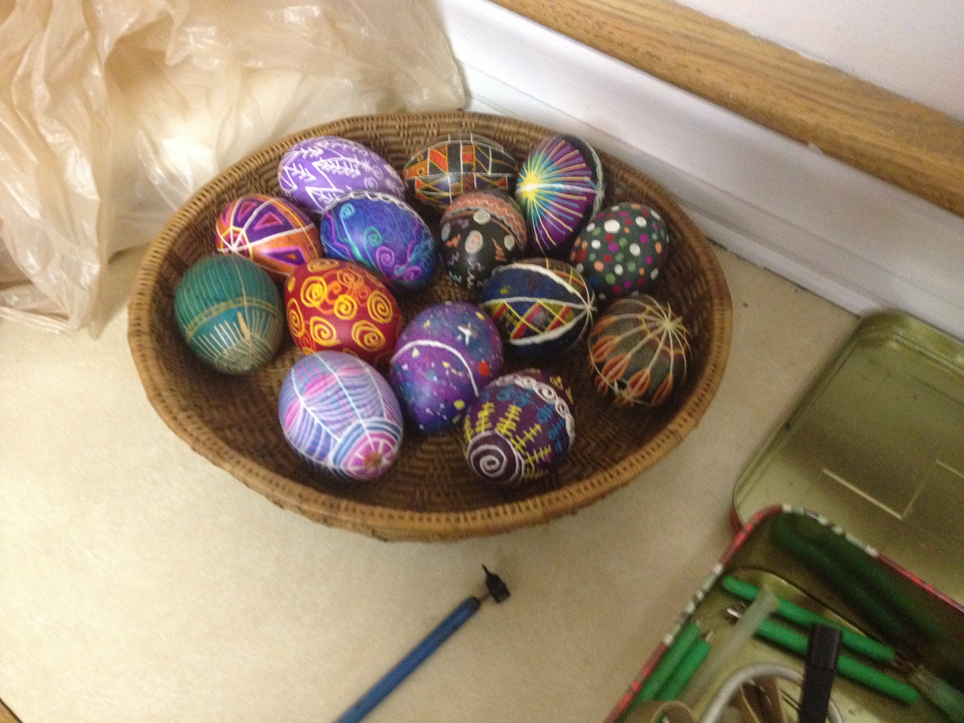 After letting the dye dry, we pricked a hole in the egg and blew out the content of the egg. Marty shared that in the Ukraine, the raw eggs are left intact! She told us we didn’t want to be around when they exploded…yuck!