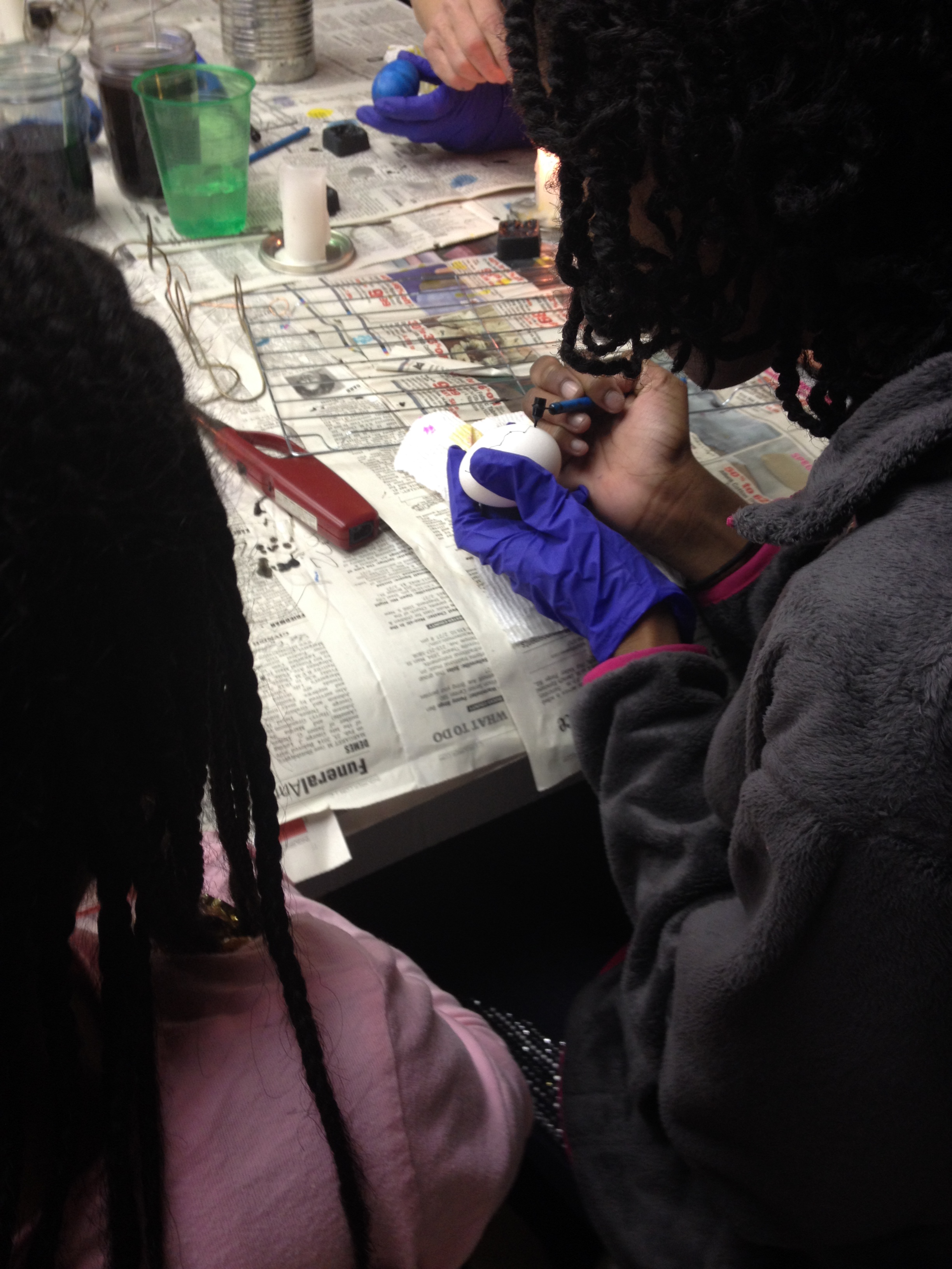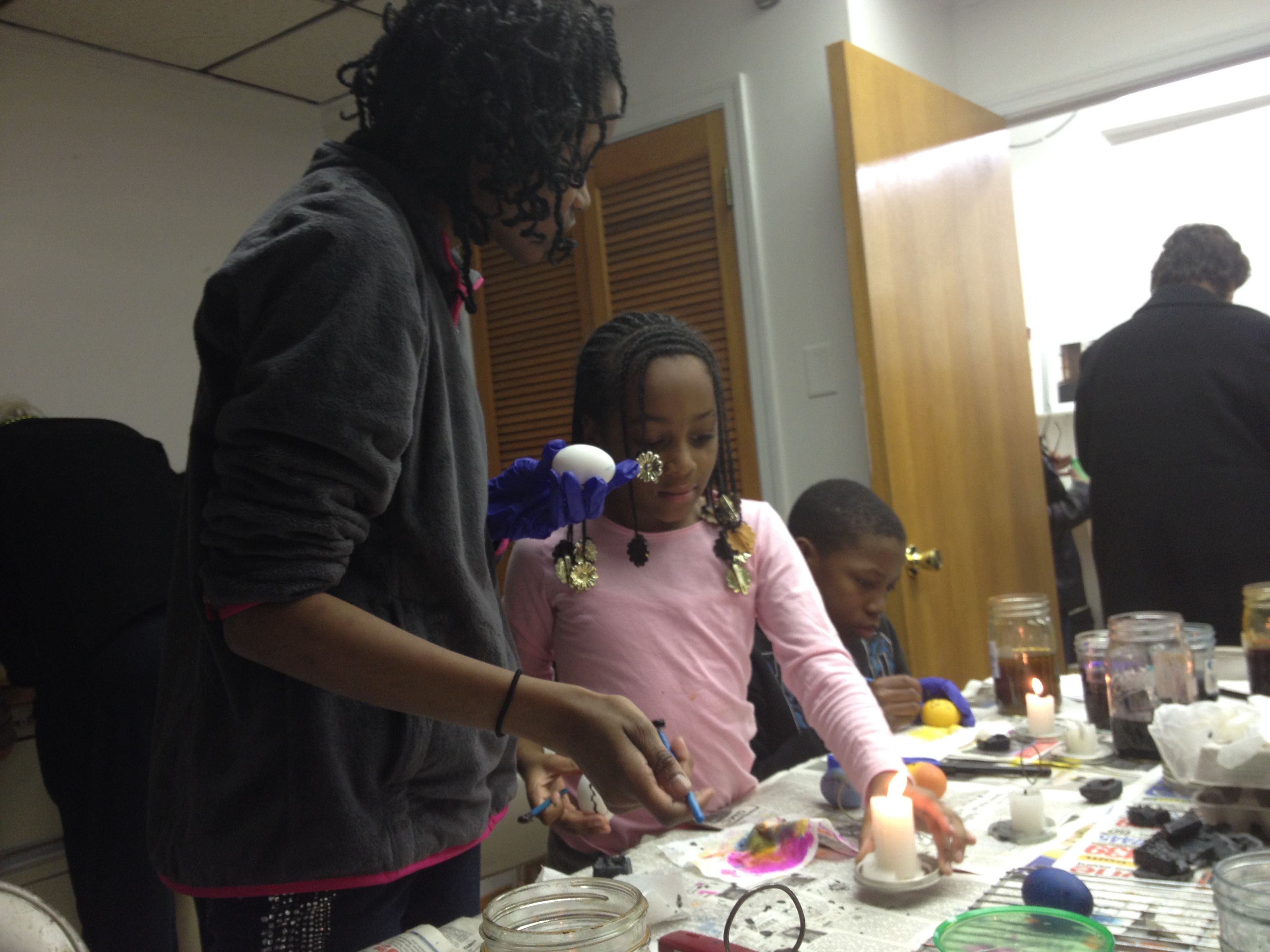 We were given raw eggs and showed how to use a Kistna, which is like a pencil or stylus to write on the eggs. Using a candle, we melted beeswax which we then used to create a design on the egg.